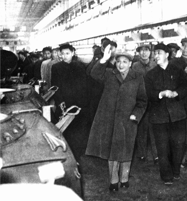 1964年4月8日中共中央總書(shū)記鄧小平視察617廠時(shí)在總裝車(chē)間向干部職工招手致意