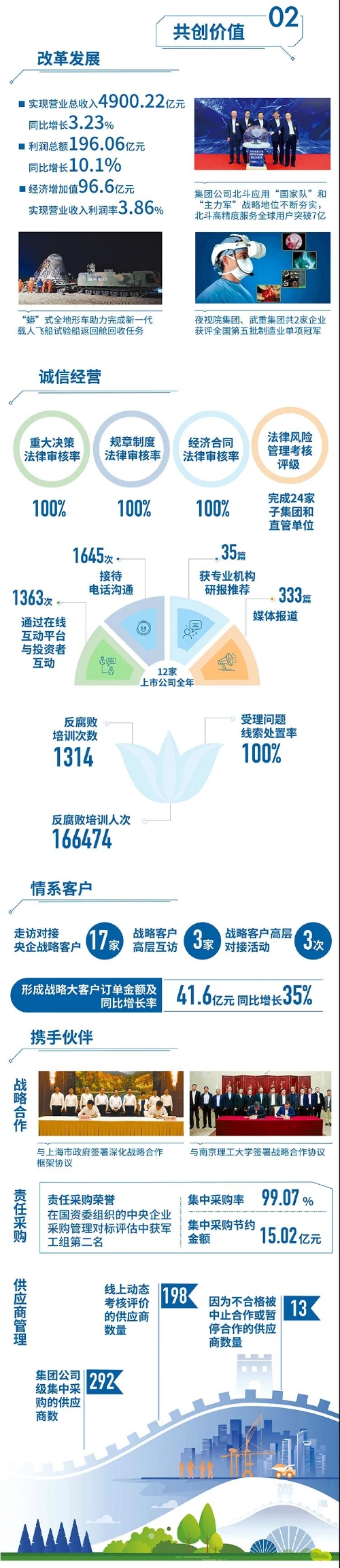 近日,國(guó)務(wù)院國(guó)資委在京舉辦“責(zé)任創(chuàng)造價(jià)值,責(zé)任引領(lǐng)未來——中央企業(yè)社會(huì)責(zé)任報(bào)告集中發(fā)布活動(dòng)(2021)”,來自中央企業(yè)的92份《報(bào)告》向公眾全面展示央企認(rèn)真履行社會(huì)責(zé)任的成果。兵器工業(yè)集團(tuán)參加集中發(fā)布活動(dòng),并向社會(huì)公眾正式發(fā)布第十二份年度社會(huì)責(zé)任報(bào)告——《中國(guó)兵器工業(yè)集團(tuán)有限公司2020年社會(huì)責(zé)任報(bào)告》,全面披露2020年度集團(tuán)公司履責(zé)實(shí)踐和履責(zé)成效。會(huì)上發(fā)布了《中央企業(yè)社會(huì)責(zé)任藍(lán)皮書(2021)》,《中國(guó)兵器工業(yè)集團(tuán)有限公司:內(nèi)化于心外化于行,打造央企責(zé)任管理表率》成功入選典型案例。 2020年,是“十三五”規(guī)劃收官之年,也是全面建成小康社會(huì)、實(shí)現(xiàn)第一個(gè)百年目標(biāo)的決勝之年。集團(tuán)公司黨組書記、董事長(zhǎng)焦開河在報(bào)告開篇指出,集團(tuán)公司實(shí)現(xiàn)了“十三五”圓滿收官,整體步入了高質(zhì)量發(fā)展軌道,呈現(xiàn)出基礎(chǔ)更牢、動(dòng)力更強(qiáng)、空間更大、效能更高的積極向上良好態(tài)勢(shì)。在“十三五”特別是近三年來的工作實(shí)踐中,我們明確了“集團(tuán)公司是國(guó)家安全和國(guó)防建設(shè)的脊梁、是國(guó)家戰(zhàn)略科技力量最為重要的組成部分、是黨和國(guó)家最可信賴的‘六個(gè)力量’,肩負(fù)著支撐國(guó)防軍隊(duì)建設(shè)、推動(dòng)科技自立自強(qiáng)、服務(wù)構(gòu)建新發(fā)展格局的重大政治責(zé)任和光榮使命,具有極強(qiáng)的政治屬性,性質(zhì)特殊、使命特殊、責(zé)任特殊”的新時(shí)代新階段職責(zé)使命,深化了對(duì)“堅(jiān)持以習(xí)近平新時(shí)代中國(guó)特色社會(huì)主義思想定向領(lǐng)航,是集團(tuán)公司高質(zhì)量發(fā)展的根本遵循;保持貫徹落實(shí)習(xí)近平總書記重要指示批示和黨中央決策部署的戰(zhàn)略定力,是集團(tuán)公司高質(zhì)量發(fā)展的根本前提;履行好強(qiáng)軍這個(gè)首要職責(zé),是集團(tuán)公司高質(zhì)量發(fā)展的根本要求;加快兵器科技創(chuàng)新突破,是集團(tuán)公司高質(zhì)量發(fā)展的根本支撐;加強(qiáng)黨的領(lǐng)導(dǎo)黨的建設(shè),是集團(tuán)公司高質(zhì)量發(fā)展的根本保證”的兵器工業(yè)改革發(fā)展規(guī)律認(rèn)識(shí)。 《報(bào)告》聚焦“抗疫斗爭(zhēng)中的‘兵器力量’”,生動(dòng)展示了集團(tuán)公司抗擊疫情的有力行動(dòng),展現(xiàn)了集中力量辦大事、急國(guó)家之所急的“兵器速度”,彰顯了“把一切獻(xiàn)給黨”的人民兵工精神和貫徹落實(shí)國(guó)家決策部署的責(zé)任擔(dān)當(dāng)?!秷?bào)告》以“用心守候和平、用情溫暖社會(huì)”為主題,從恪守本責(zé)、共創(chuàng)價(jià)值、致力和諧、踐行綠色、責(zé)任管理五個(gè)維度,全面展現(xiàn)集團(tuán)公司在堅(jiān)持履行政治責(zé)任、經(jīng)濟(jì)責(zé)任、社會(huì)責(zé)任,履行強(qiáng)軍首責(zé)、加強(qiáng)黨的建設(shè)、打造國(guó)家戰(zhàn)略科技力量、推進(jìn)“一帶一路”倡議、打好打贏三大攻堅(jiān)戰(zhàn)、深化改革、助力員工成長(zhǎng)、支持社會(huì)公益事業(yè)、提升社會(huì)責(zé)任管理等方面的生動(dòng)實(shí)踐和履責(zé)亮點(diǎn),凸顯集團(tuán)公司保持貫徹落實(shí)黨中央決策部署的戰(zhàn)略定力、在聚焦主責(zé)主業(yè)、科技引領(lǐng)、國(guó)際化經(jīng)營(yíng)上持續(xù)用力,為實(shí)現(xiàn)第一個(gè)百年奮斗目標(biāo)貢獻(xiàn)力量的初心與行動(dòng)?!秷?bào)告》再次獲得中國(guó)企業(yè)社會(huì)責(zé)任報(bào)告評(píng)級(jí)專家委員會(huì)“五星佳”最高評(píng)級(jí),兵器工業(yè)集團(tuán)成為軍工行業(yè)唯一連續(xù)10年獲得最高評(píng)級(jí)的企業(yè)。 2021年是開啟新征程的開局之年,也是建黨100周年、人民兵工創(chuàng)建90周年,兵器工業(yè)集團(tuán)將全面貫徹落實(shí)黨中央戰(zhàn)略部署,緊扣推動(dòng)高質(zhì)量發(fā)展主題,圍繞“十四五”開好局、起好步,堅(jiān)決完成黨中央賦予的職責(zé)使命,履行好中央企業(yè)和軍工集團(tuán)的政治責(zé)任、經(jīng)濟(jì)責(zé)任、社會(huì)責(zé)任,為實(shí)現(xiàn)中國(guó)夢(mèng)強(qiáng)軍夢(mèng)作出新的更大貢獻(xiàn)! 一圖看懂《中國(guó)兵器工業(yè)集團(tuán)有限公司2020年社會(huì)責(zé)任報(bào)告》 |