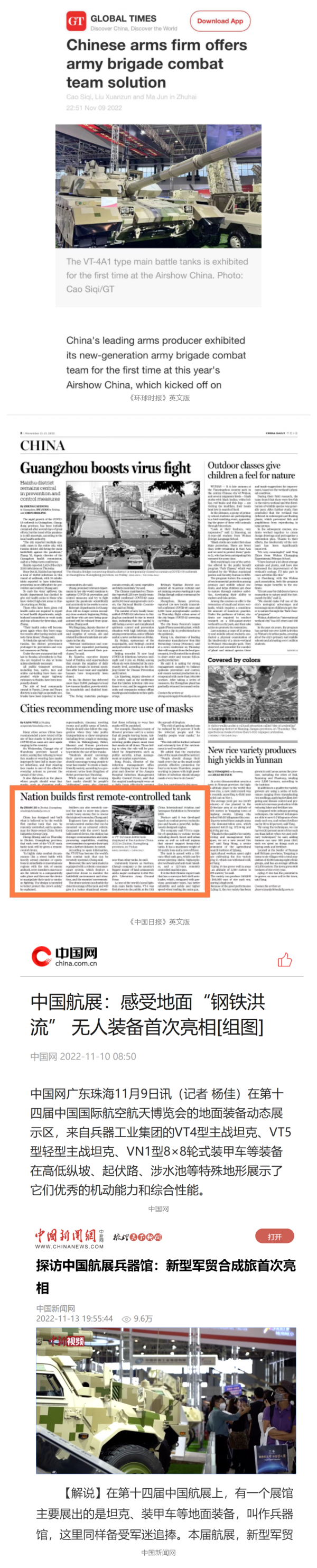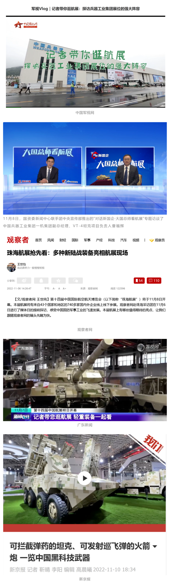 央視國(guó)防軍事頻道航展特別報(bào)道《炫舞天地間》11月12日《賞“鐵甲雄風(fēng)”!看航展地面裝備“鋼鐵洪流”名場(chǎng)面》對(duì)兵器工業(yè)集團(tuán)武器裝備特色亮點(diǎn)進(jìn)行報(bào)道。《國(guó)防軍事早報(bào)》11月7日推出報(bào)道《第十四屆中國(guó)國(guó)際航空航天博覽會(huì)明天開(kāi)幕 中國(guó)兵器館首次以陸軍合成旅實(shí)戰(zhàn)體系形式展出》,對(duì)兵器館陸軍合成旅實(shí)戰(zhàn)體系進(jìn)行報(bào)道。《軍事報(bào)道》11月9日推出《第十四屆中國(guó)國(guó)際航空航天博覽會(huì) 地面兵器裝備首次聯(lián)合陸航直升機(jī)進(jìn)行動(dòng)態(tài)展示》報(bào)道。《軍迷行天下》11月9日推出報(bào)道《軍迷打卡航展2022》以專(zhuān)業(yè)軍迷視角探館兵器館,全面展示兵器工業(yè)集團(tuán)參展裝備特色亮點(diǎn)。