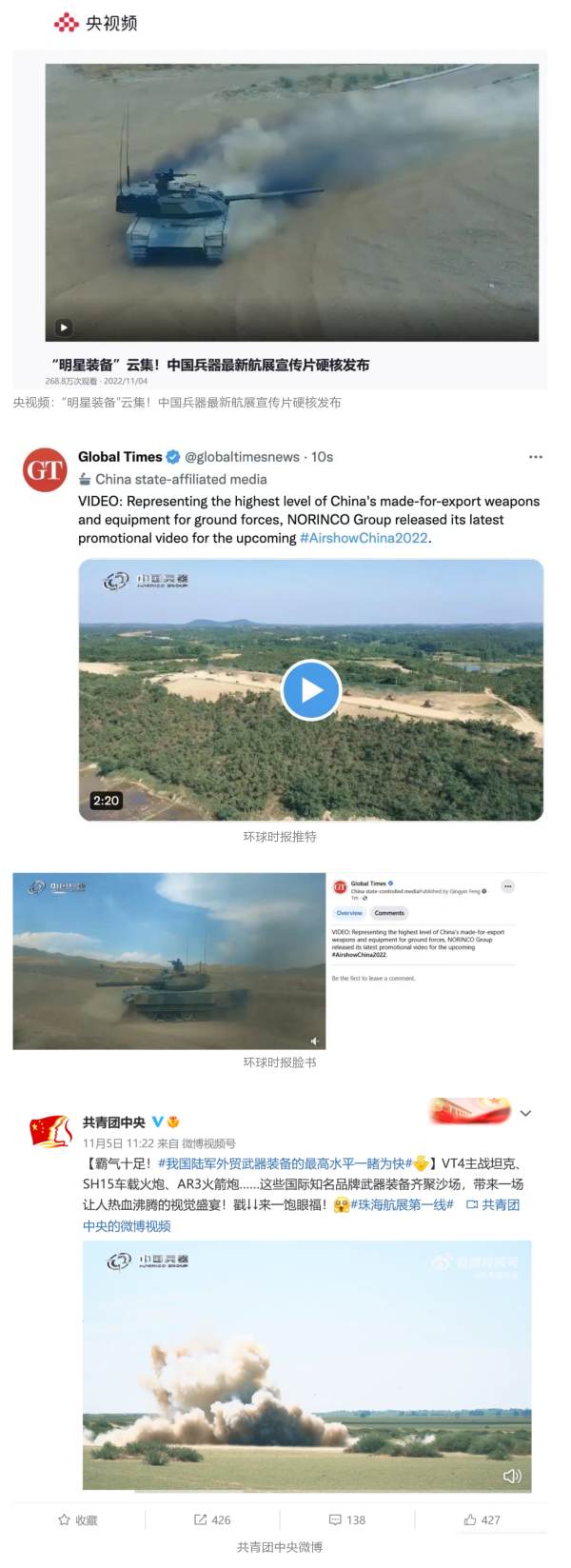 人民日?qǐng)?bào)官方微博、微信公眾號(hào),新華社客戶(hù)端、央視新聞客戶(hù)端、中國(guó)日?qǐng)?bào)微博、參考消息微信公眾號(hào)、解放軍報(bào)微博、央視軍事微博、CGTN微博、中國(guó)軍號(hào)微博、共青團(tuán)中央微博、環(huán)球時(shí)報(bào)(英文網(wǎng)站、臉書(shū)賬號(hào)、推特賬號(hào))、嗶哩嗶哩、學(xué)習(xí)強(qiáng)國(guó)平臺(tái)、國(guó)資小新視頻號(hào)、網(wǎng)易軍事、騰訊軍事、鳳凰軍事、北京日?qǐng)?bào)、東方衛(wèi)視看看新聞全媒體、北京電視臺(tái)等20余家中央主流媒體、國(guó)家部委、省市媒體的新媒體第一時(shí)間播發(fā)集團(tuán)公司航展宣傳片等視頻作品燃爆全網(wǎng),累計(jì)閱讀量突破1700萬(wàn)人次。集團(tuán)公司微信公眾號(hào)、微博、抖音號(hào)、快手號(hào)、微信視頻號(hào)、知乎號(hào)等新媒體宣傳片播放閱讀量超過(guò)800萬(wàn)人次,點(diǎn)贊超過(guò)30萬(wàn)人次。集團(tuán)公司微信公眾號(hào)推出《硬核!中國(guó)兵器最新航展宣傳片發(fā)布》《中國(guó)兵器航展節(jié)目單,請(qǐng)選出心中明星裝備》《航展首日,中國(guó)兵器閃耀亮相!》等7篇報(bào)道,閱讀量超過(guò)25萬(wàn)人次,集團(tuán)公司微信視頻號(hào)、抖音號(hào)、快手號(hào)等新媒體賬號(hào)發(fā)布“中國(guó)兵器航展大秀”系列視頻,觀看量超過(guò)330萬(wàn)人次。