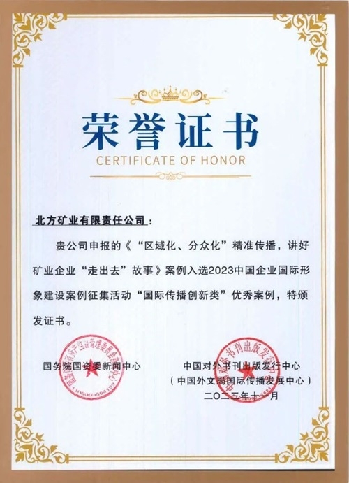 論壇上,“2023中國企業(yè)國際形象建設案例征集活動”評選結果揭曉。評選活動以“挖掘典型案例、建設企業(yè)形象、講好中國故事”為宗旨,從來自中央企業(yè)、地方國企及民營企業(yè)報送的251個有效案例中遴選出“共建新絲路”“跨文化融合”“國際傳播創(chuàng)新”“筑夢人物故事”四類專項優(yōu)秀案例共40個。中國兵器工業(yè)集團北方公司北方礦業(yè)有限責任公司案例《“區(qū)域化、分眾化”精準傳播,講好礦業(yè)企業(yè)“走出去”故事》入選“國際傳播創(chuàng)新類”優(yōu)秀案例。