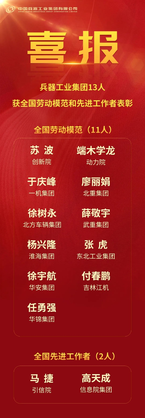 兵器工業(yè)集團(tuán)13人獲全國(guó)勞動(dòng)模范和先進(jìn)工作者表彰